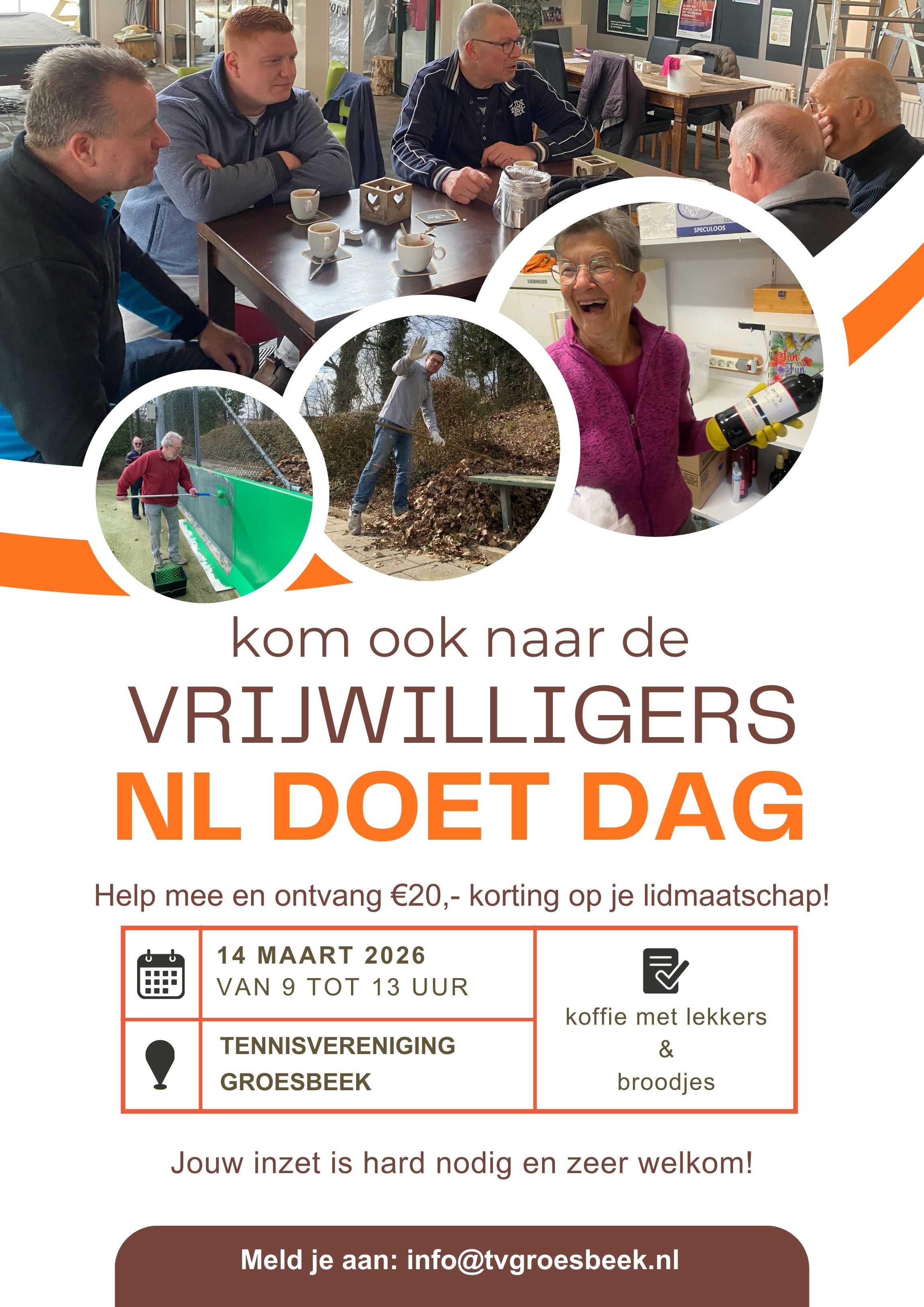 Laat even weten als je aanwezig bent tijdens de NLDoet dag bij Tennisvereniging Groesbeek en of je bij de lunch aanwezig bent. Dit kan via [email protected]
