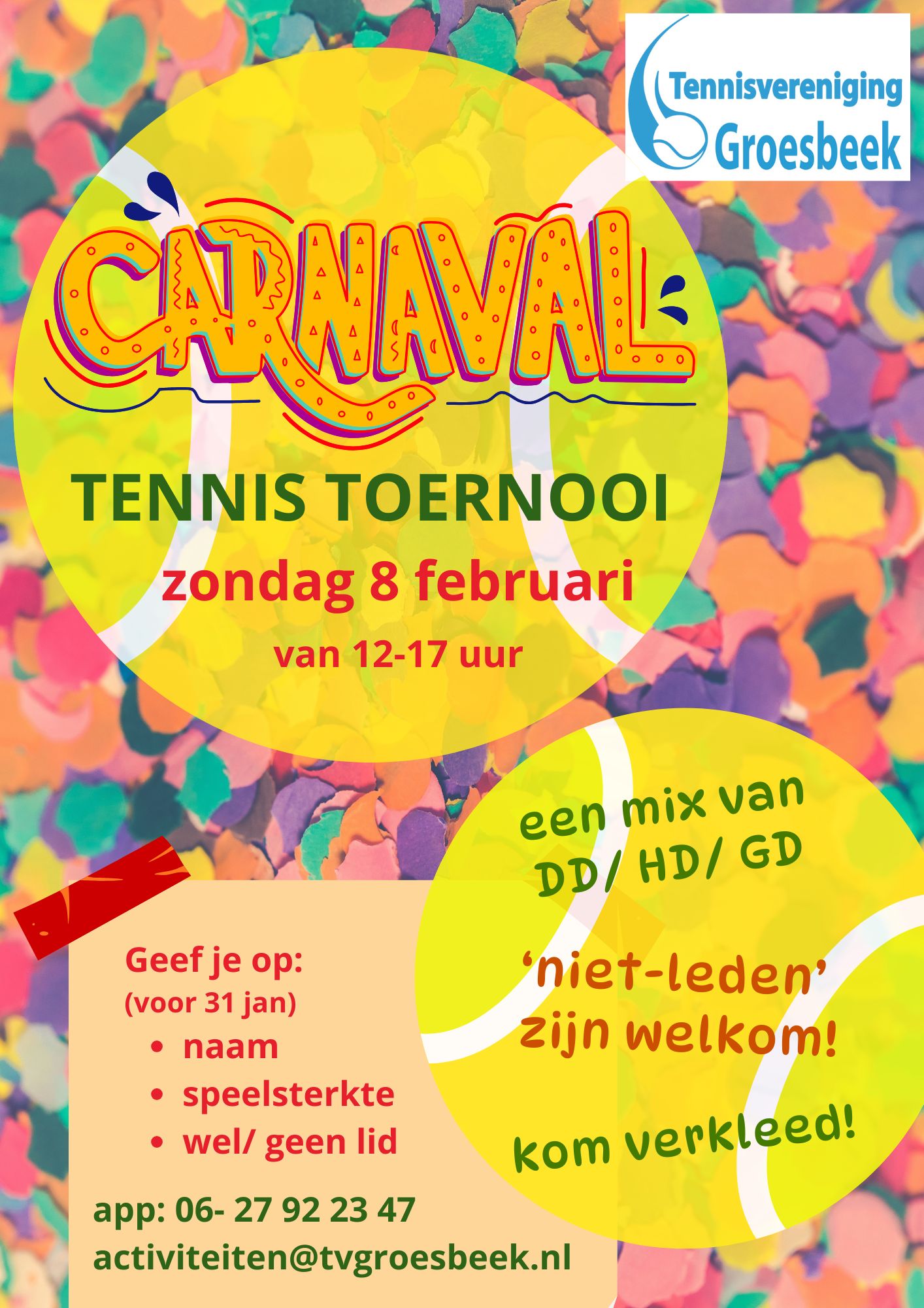 Na het succes van de vorige editie zal ook komend jaar het carnaval tennistoernooi plaatsvinden. In dit toernooi is niks te gek! Heren dubbel, dames dubbel en gemengd dubbel, gender maakt niet uit, iedereen speelt tegen elkaar. Natuurlijk proberen we met niveau rekening te houden. Naast leden zijn dit toernooi ook niet-leden van harte welkom! Dus neem gezellig mensen mee en vorm duo’s. Weet je de punten niet met tennissen te behalen, sleep deze dan binnen met je carnavals outfit. Verkleden is namelijk verplicht!