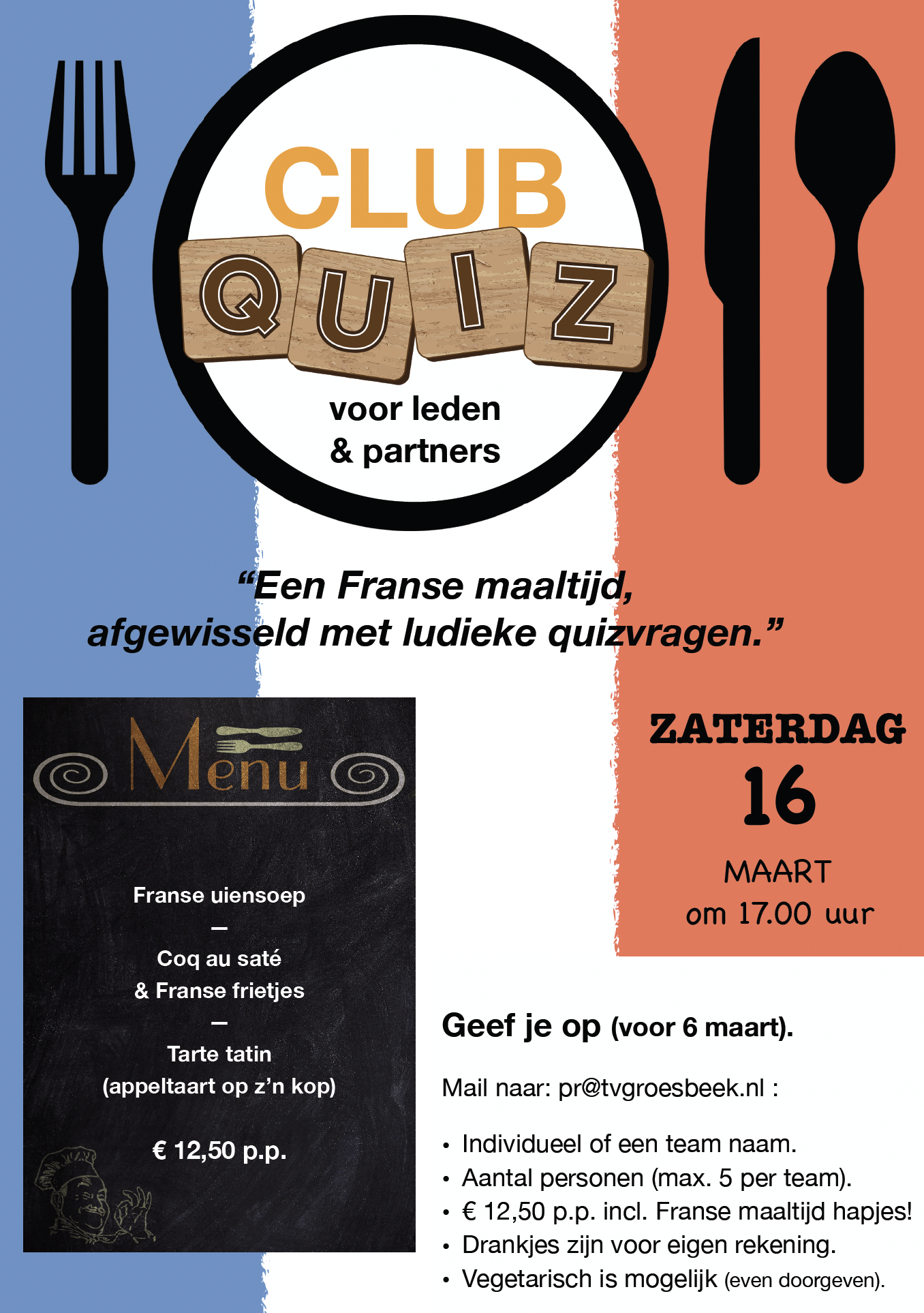 Op zaterdag 16 maart is er een Club Quiz, inclusief een Franse maaltijd! Je kunt je individueel opgeven (wij delen je dan in) of met een groepje van max. 5 personen. Om dit te bekostigen wordt er een bijdrage van €12,50 p.p. gevraagd, dit is natuurlijk inclusief het lekkere eten.