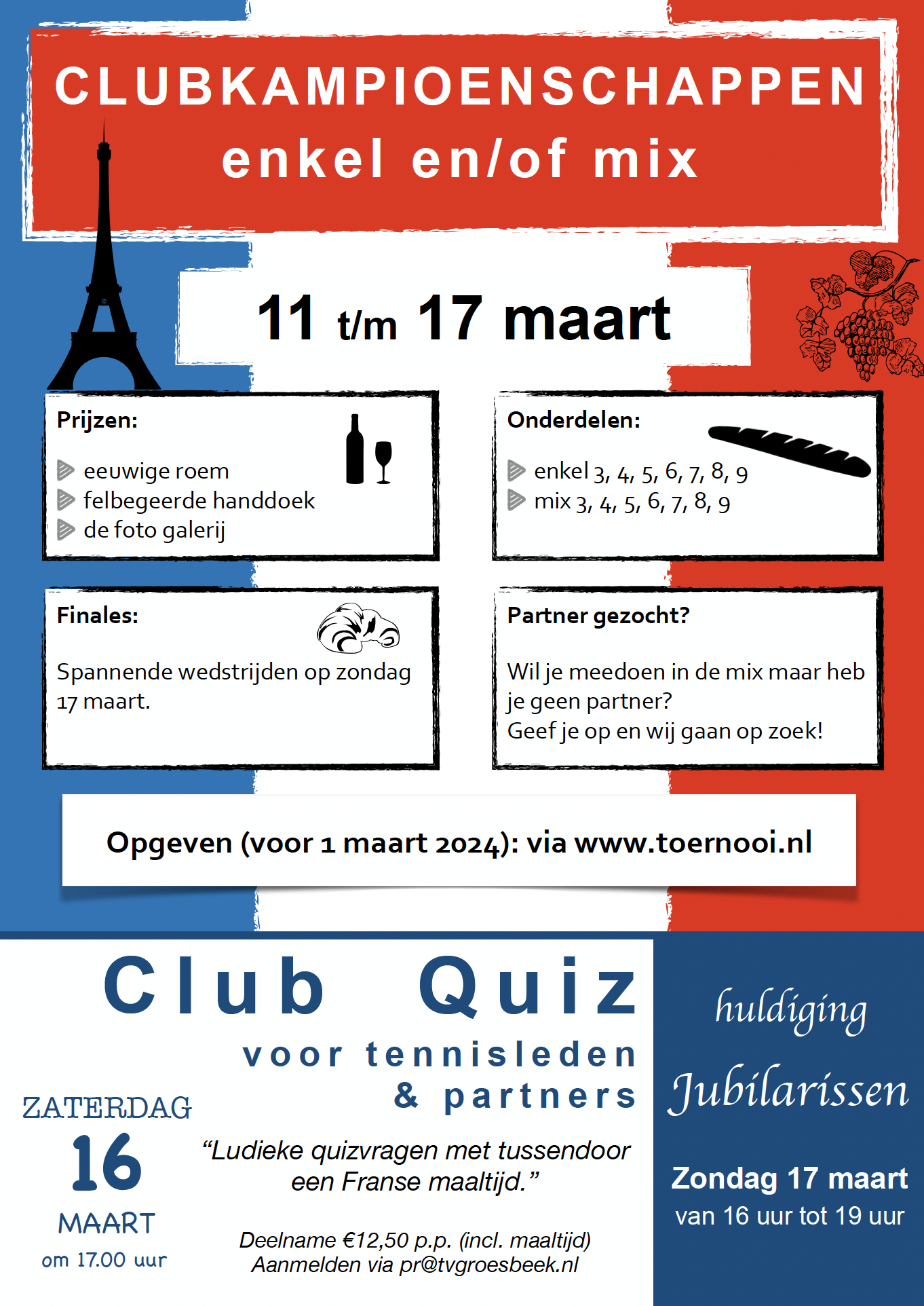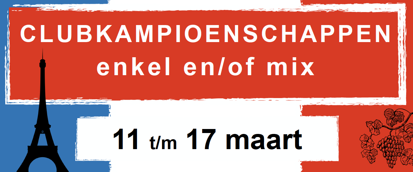 Het is weer mogelijk om je op te geven voor de clubkampioenschappen! Deze zijn van maandag 11 t/m zondag 17 maart. De onderdelen zijn enkel en/of mix en er zijn diverse speelsterktes. Je kunt dus ook meedoen als je nog niet zo lang tennist, je wordt op je eigen niveau ingedeeld.