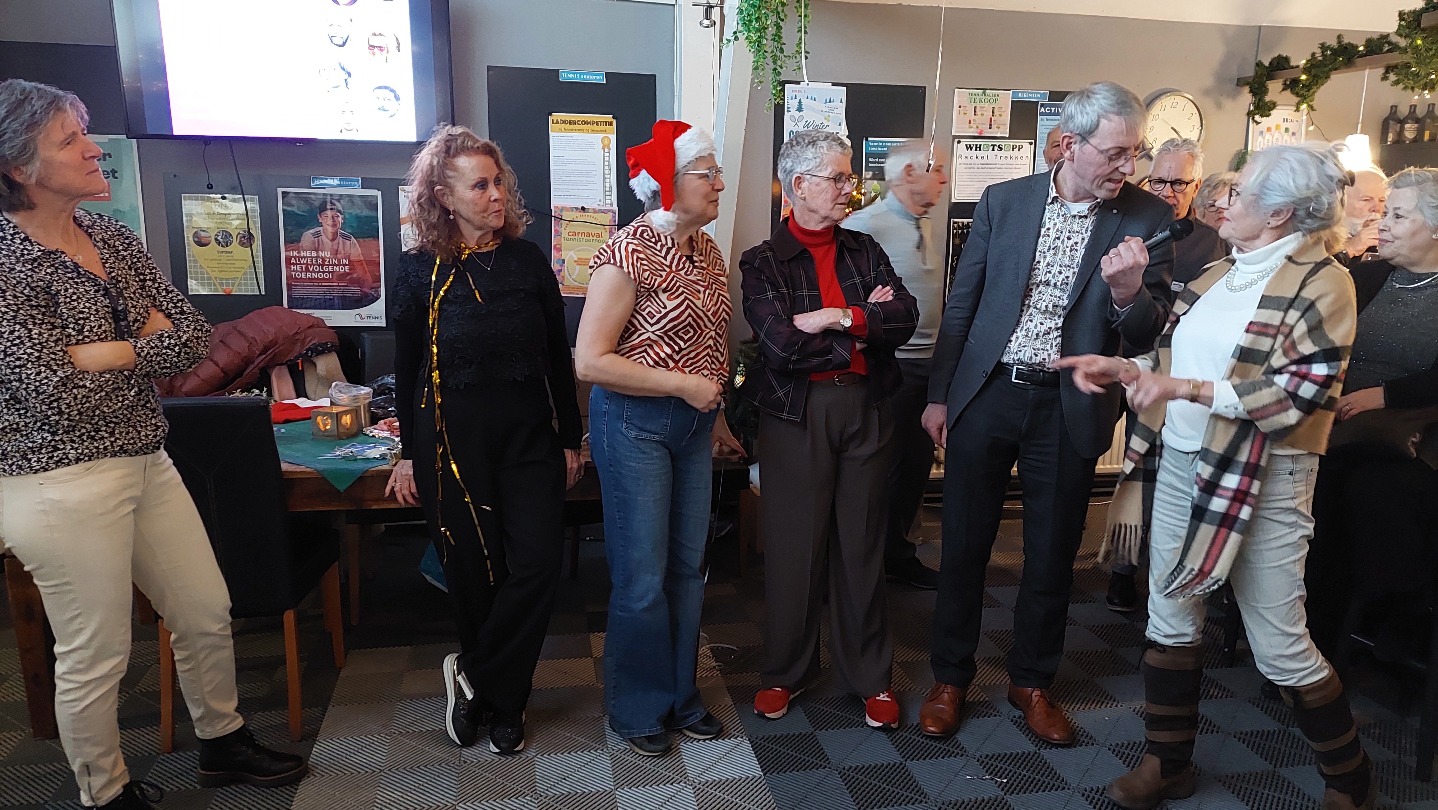 Onder het genot van een sprankelend welkomsdrankje met een heerlijke oliebol werden de bezoekers door voorzitter Wouter van harte welkom geheten. De middag ging van start met een enorm applaus voor Miep en Peter. Na héél veel dienstjaren bij de barcommissie, geven zij het stokje over aan Danny.