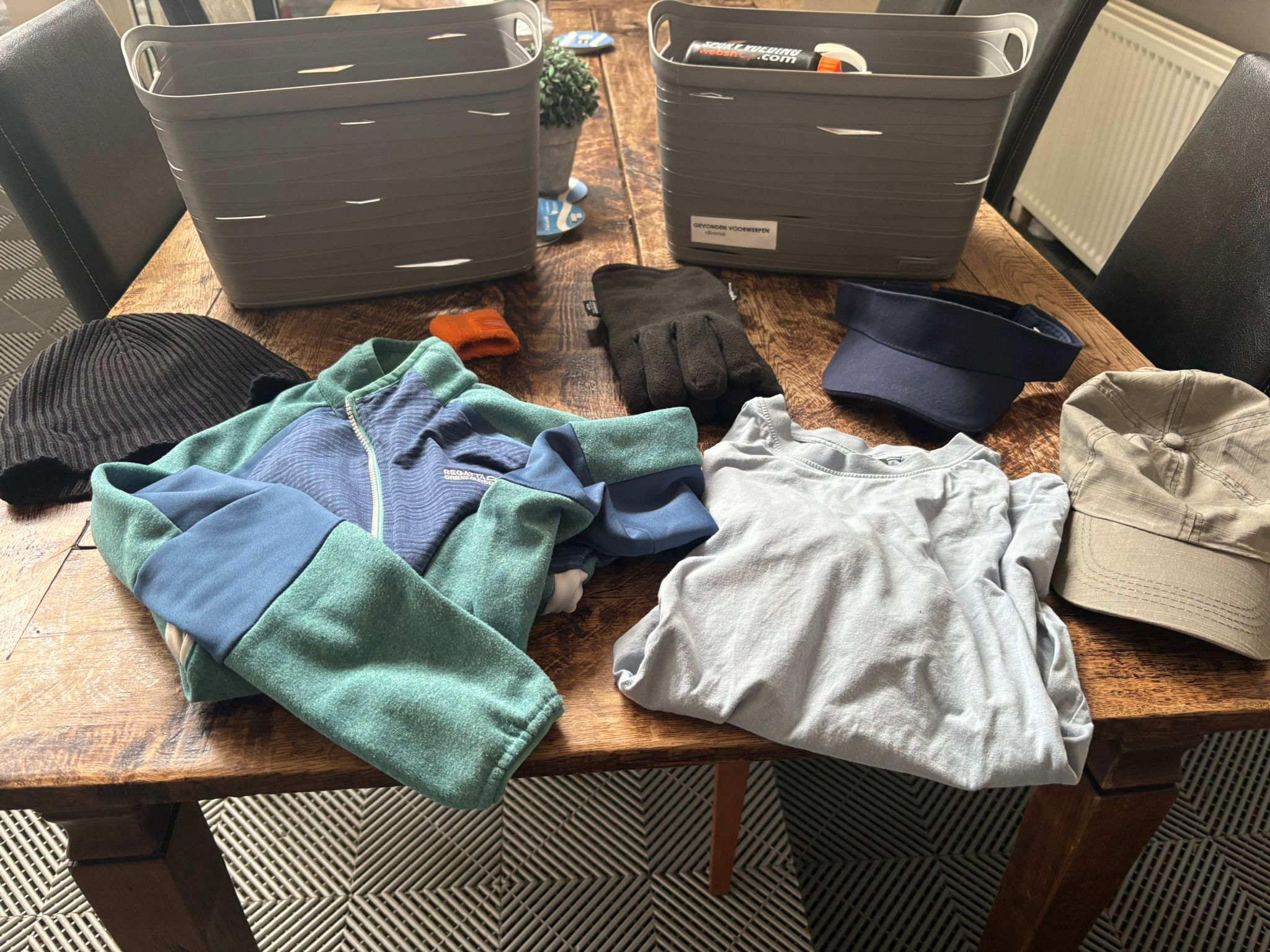 De bak puilt inmiddels uit van de bidons, truien en andere kledingstukken. Neem dus snel even een kijkje of er iets van jou tussen zit. Je vindt de bak op de plank boven de kapstok in de gang.