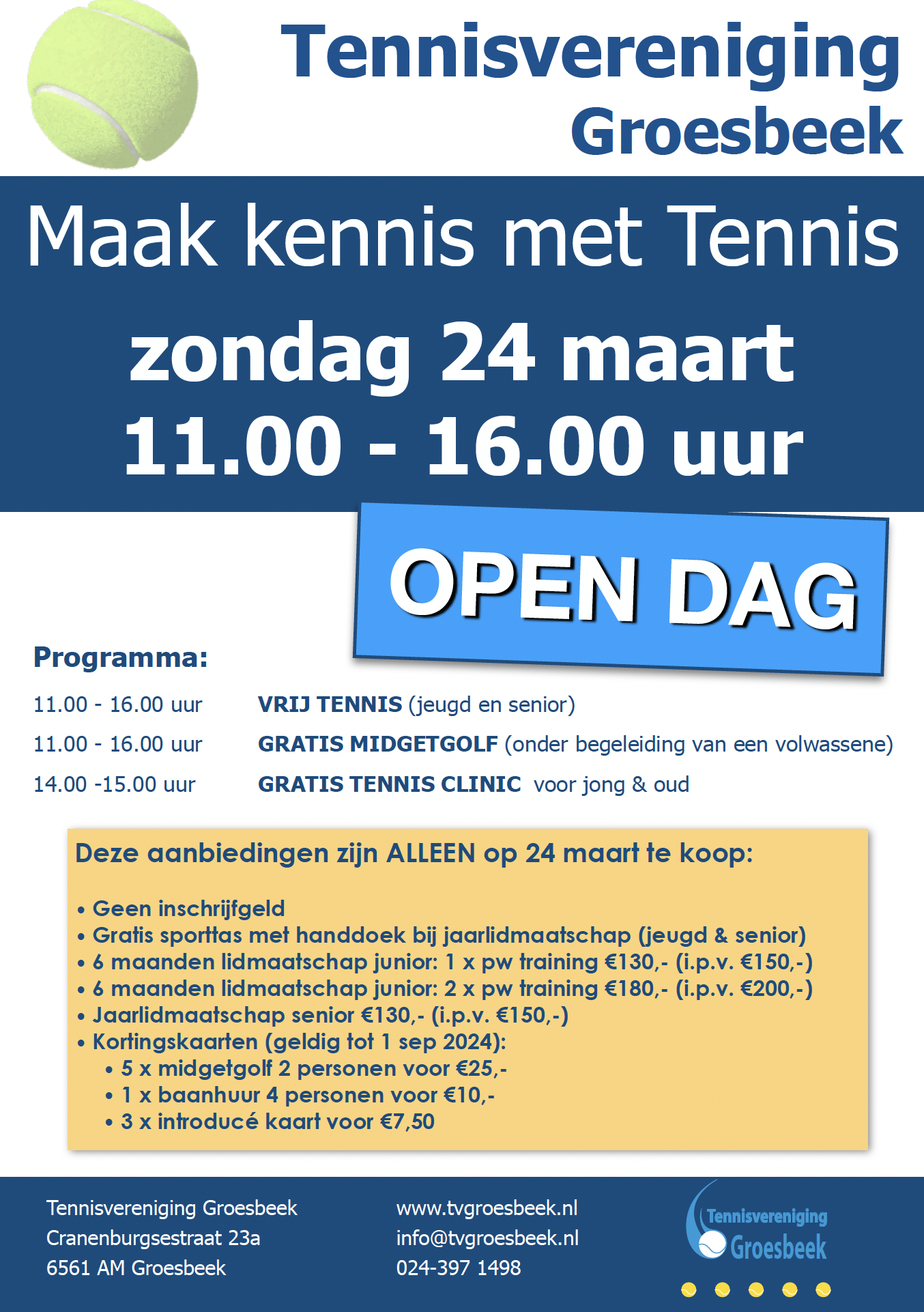 Op zondag 24 maart is iedereen van harte welkom tijdens de Open Dag van Tennisvereniging Groesbeek. Mensen die nog geen lid zijn, kunnen dan kennismaken met deze leuke sport en onze gezellige tennisvereniging. Tijdens de Open Dag kan men tussen 11 en 16 uur gratis komen tennissen en midgetgolfen. U kunt eventueel een tennisracket lenen.